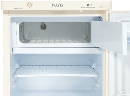 В отличие от своего предыдущего “собрата” не имеет морозильной камеры. Но за счет ее отсутствия увеличился полезный объем холодильного отсека. Поэтому вы без проблем сможете поместить в нем продукты даже на целую семью. Внутри камеры расположены металлические полки и пластиковые ящики для скоропортящихся продуктов, а на дверце — стандартный контейнер под яйца и балкончики для мелочевки и бутылок. В эксплуатации прост и неприхотлив. Достаточно лишь иногда сливать воду, которая скапливается в поддоне, и периодически мыть холодильник. У этого продукта от Позис также широкий цветовой ряд, который позволит подобрать технику персонально для вашей кухни.