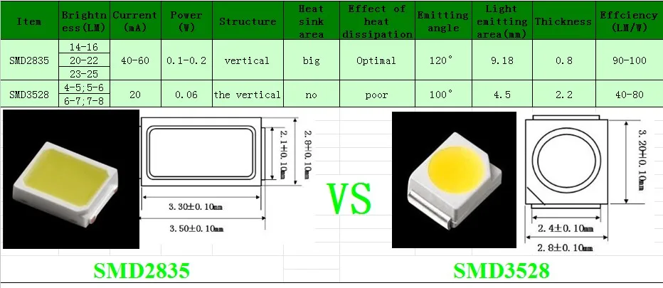 - SMD2835 и SMD3528 потребляют 0,1 Вт;