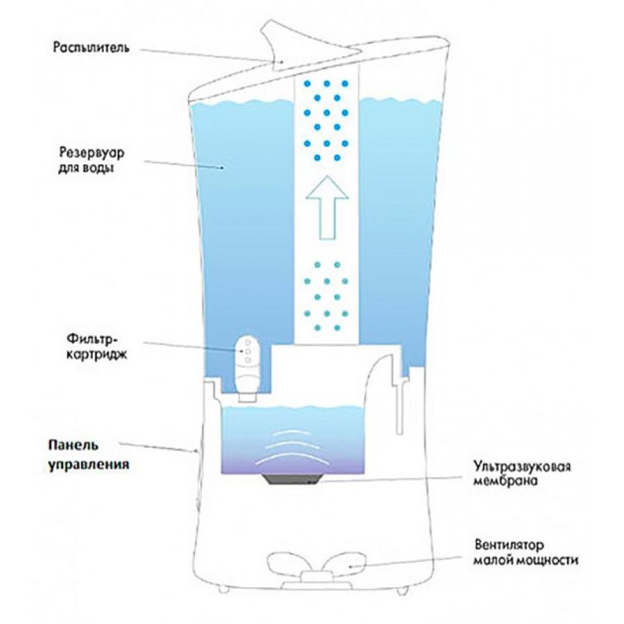 При включении прибора мембрана начинает колебаться с ультразвуковой частотой (отсюда и название увлажнителя воздуха), разбивая воду на мельчайшие мелкодисперсные частицы, образующие водяной туман. Далее при помощи вентилятора, который находиться внутри основания воздухоувлажнителя, водяная дымка поднимается по специальному туннелю внутри корпуса и через носик прибора поступает в помещение.